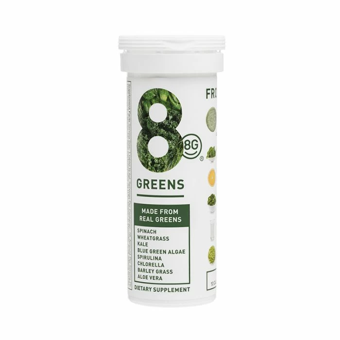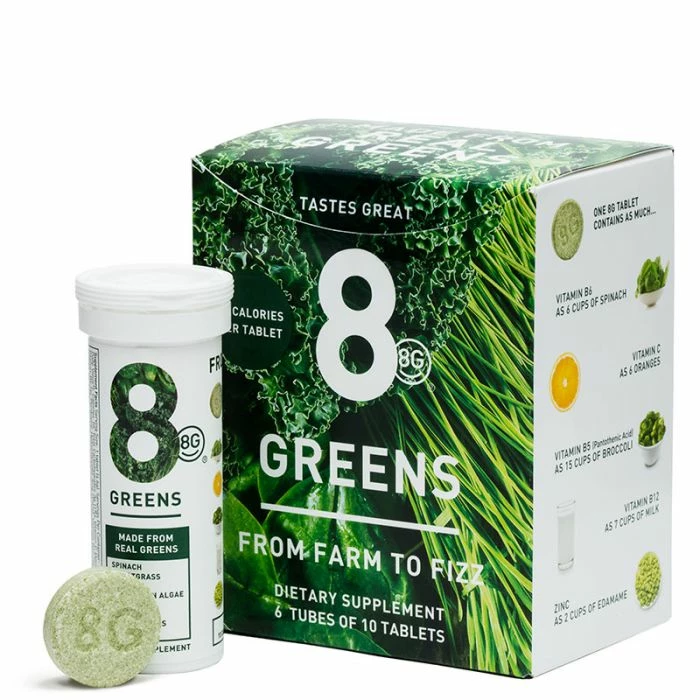 8G Essential Greens Booster is an effervescent tablet with only ten calories per tablet that packs a nutritional punch and tastes great, too. One tablet has as much vitamin C as 6 oranges, vitamin B6 as 6 cups of spinach, vitamin B5 as 15 cups of broccoli and B12 as 7 cups of milk.