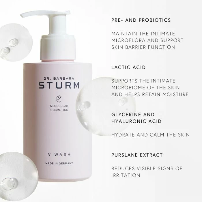 Dr. Barbara Sturmβs mild V WASH gently cleanses the intimate area, without removing natural oils or moisture from the skin, and uses a velvety, delicate foam formula that is suitable for daily cleansing, as well as for sensitive skin. It contains Pre- and Probiotics that help maintain the microbiome of the skin and its optimal, natural pH value to prevent unhealthy bacteria and yeast proliferating and causing infection. Panthenol and Glycerine soothe and moisturize the skin and Hyaluronic Acid provides soothing hydration. Purslane Extract has an antioxidative effect, calming the skin and reducing visible signs of irritation. The V WASH has been gynecologically tested.