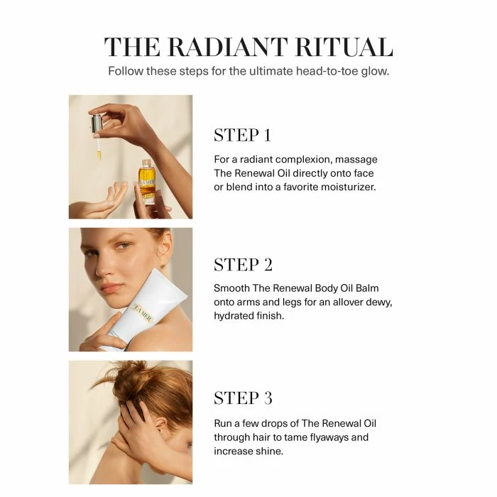 The hydrating, head-turning radiance of The Renewal Oil, reimagined in an allover body balm that invigorates the body and senses. Every sumptuous touch wraps skin in a wave of healing hydration and the kiss of a gorgeous, healthy-looking sheen. This rich, lightly scented balm melts into a silken oil on contact to create the radiant, glowing look of La Mer all over.Β